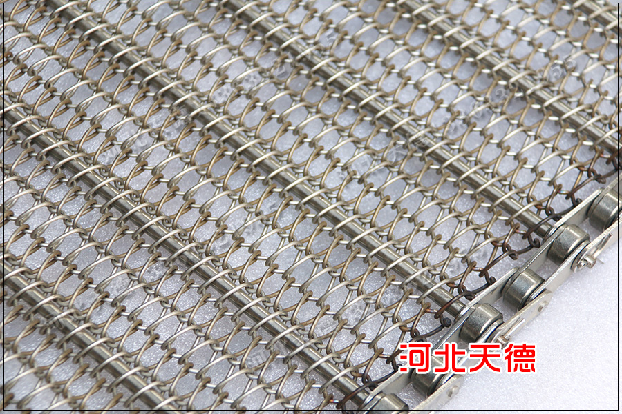 鏈條節距為38.1毫米,鏈桿直徑為8毫米,每米載重大概在10公分,烘干的食品大小大約為10*20毫米,河北天德廠家為其設計的鋼絲直徑為1.5毫米,孔大小為5*10毫米。