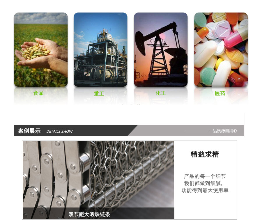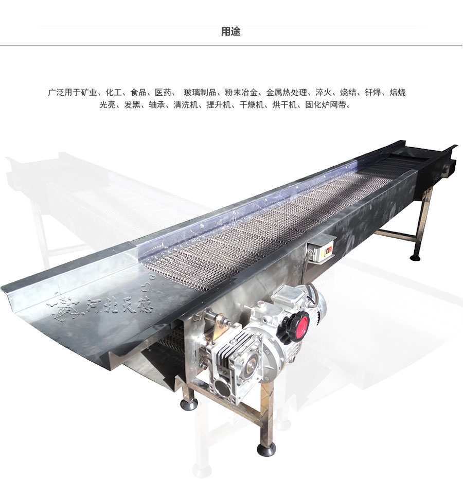 廣泛用于玻璃制品行業的退火爐網帶、烤花爐網帶等。食品加工行業、脫水蔬菜、速凍食品單凍機前處理網帶、鏈網。粉末冶金、金屬熱處理、淬火、燒結、釬焊、焙燒、光亮、發黑、軸承、滲碳高溫爐網帶、擋板式網帶、涂裝烘干線輸送網帶、泡沫鎳還原生產線網帶,清洗機、提升機、干燥機、烘干機、固化爐網帶。
