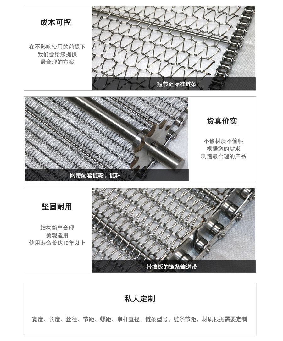 不銹鋼網帶屬于非標準件,我們將根據你提供的規格長寬,材質,絲徑,編制結構尺寸,支軸直徑,支軸間距,鏈條型號等數據核算成本和制作.