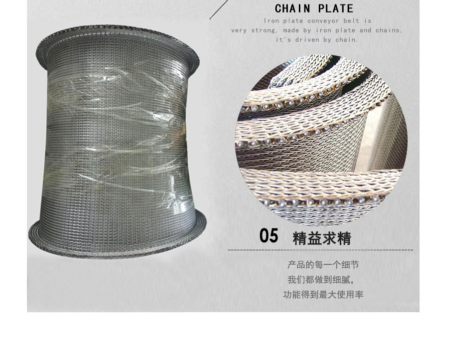 人字形網帶簡介:是由左右交替的網條通過四根直串條聯結而成,此網帶可擋住較小物件的滲漏,組合牢固,抗拉強度大,廣泛應用于石油化纖、熱處理、食品工業等行業,邊緣可加擋片,直接焊接或直接翻邊。