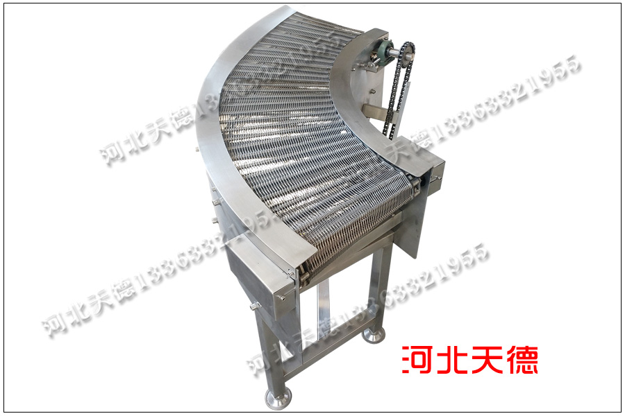 整個機器采用不銹鋼材質,轉彎角度根據客戶的需要定制的,寬度大概為40公分,輸送帶采用網狀鏈條輸送帶,輸送平穩且成本低,是食品行業中不錯的選擇。
